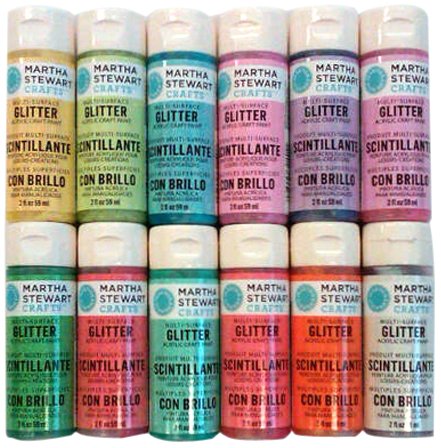 Martha stewart paints work for all surfaces - perfect for saving time and money.High performance, premium acrylic craft paint features a patented polymer resin system.It's perfect for all craft and hobby painting techniques, including brush painting and detailing, sponging, stenciling and stamping.Self priming for use on porous and non-porous surfaces.Uv and weather resistant for indoor and outdoor use..Martha Stewart PROMO773A 12 Glitter Paints, Iridescent Features.